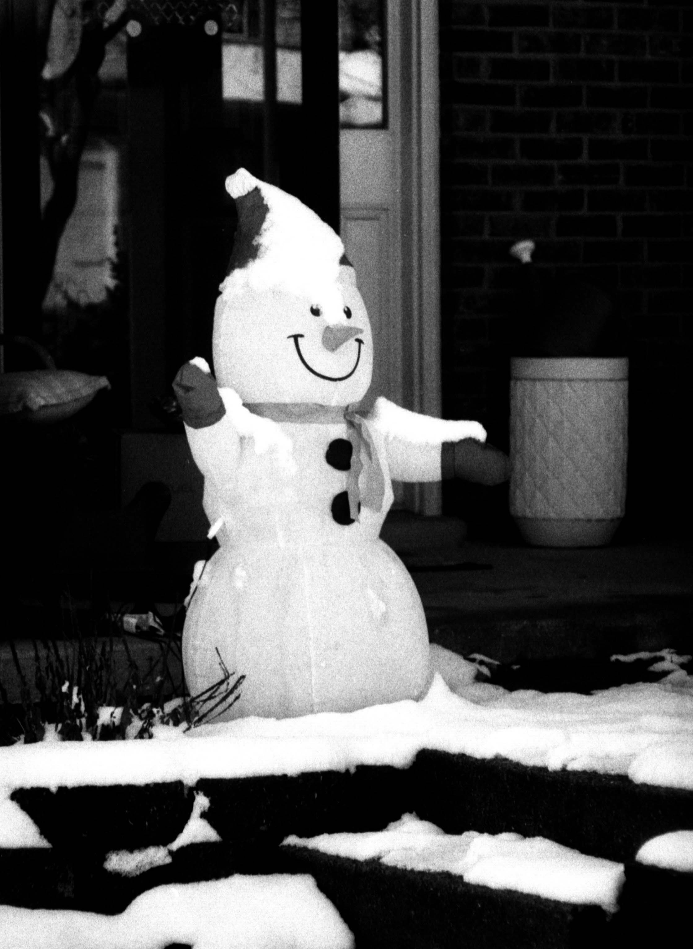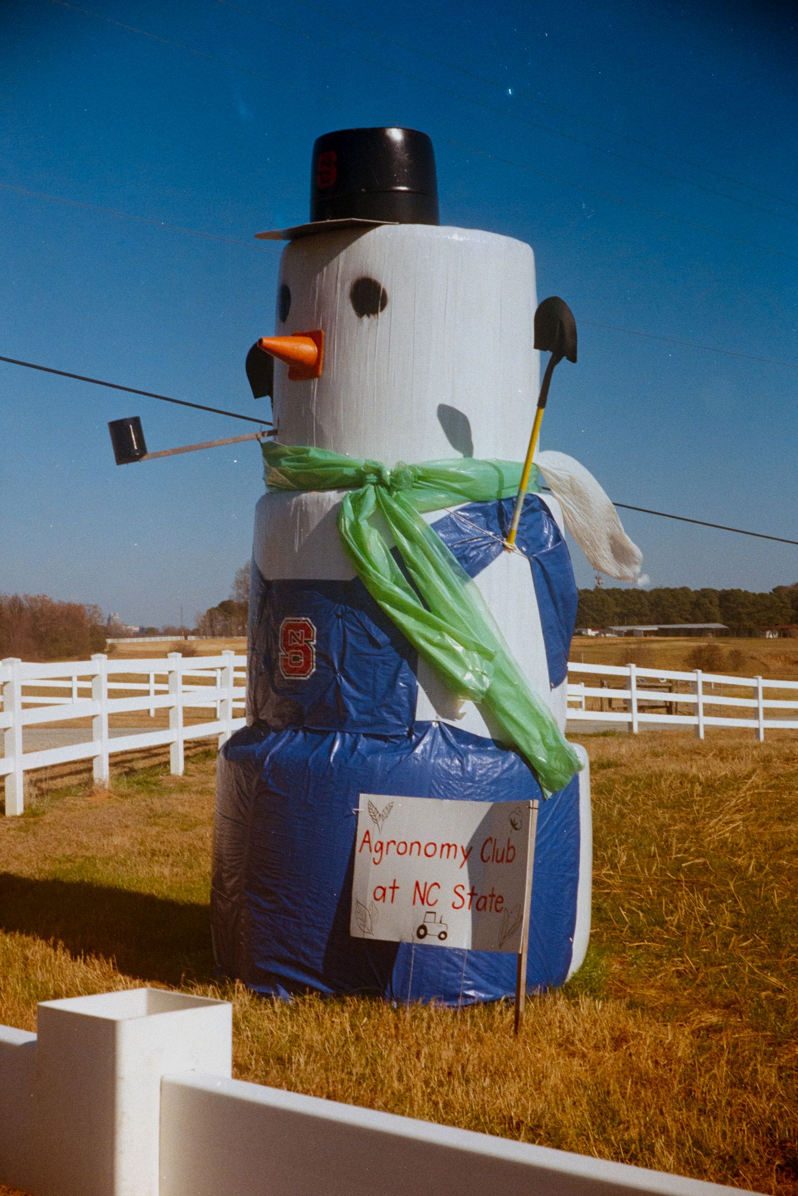 HayBail SnowMan - Snow man made of hay bales at the North Carolina State University Lake Wheeler Road Field Laboratory. Argus C3 on Kodak ProImage 100 film. f/9 at 1/75th sec. 7 Jan 2026. | Mebane Nutcracker - Nutcracker figure in downtown Mebane North