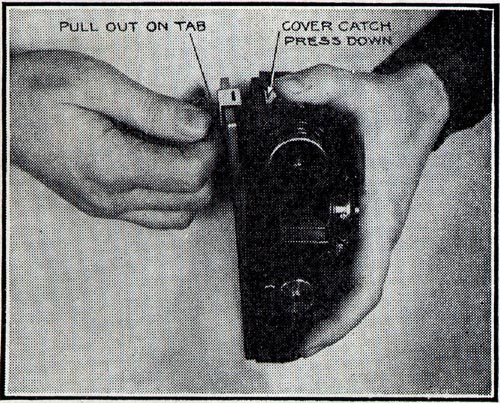 1. Remove the back cover by pressing in catch until lip clears slot on cover and pulling out on tab. (See illustration).